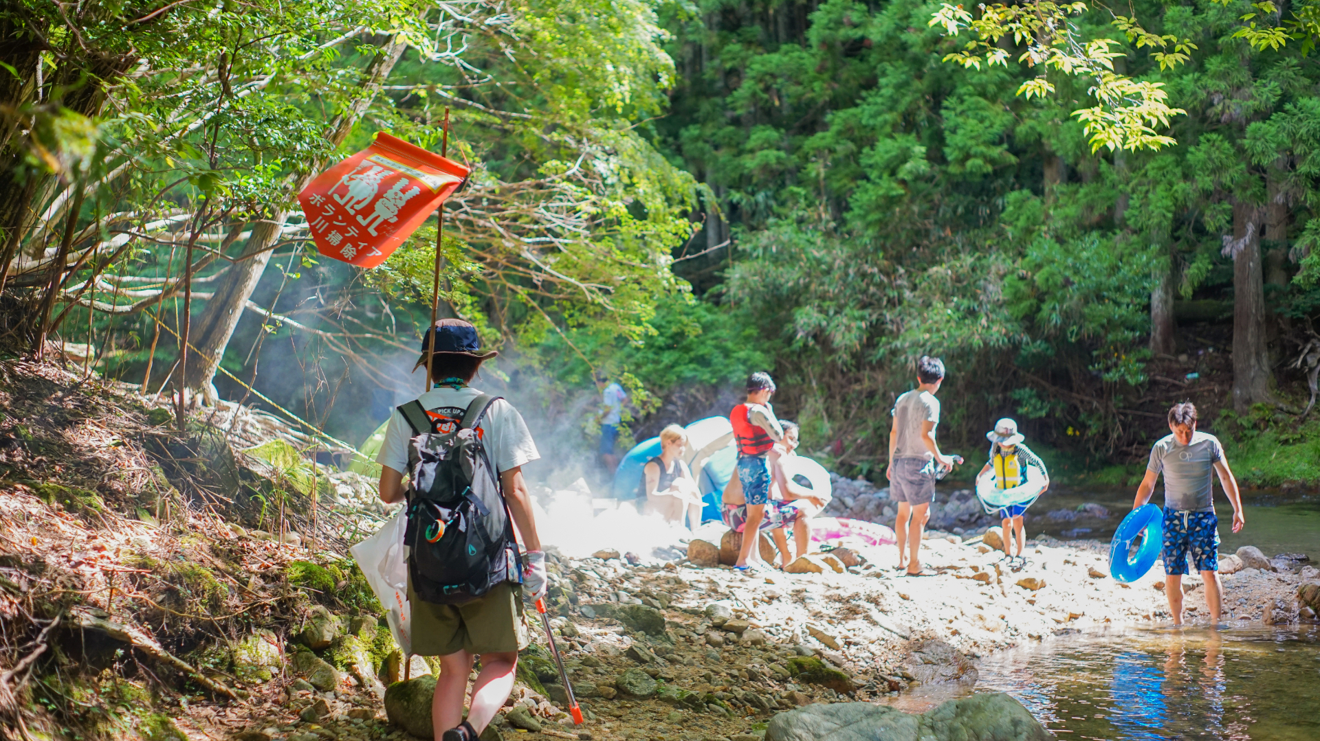 RRP活動中、プロが川の遊び方を教え、最後はともに宴を持ちます。